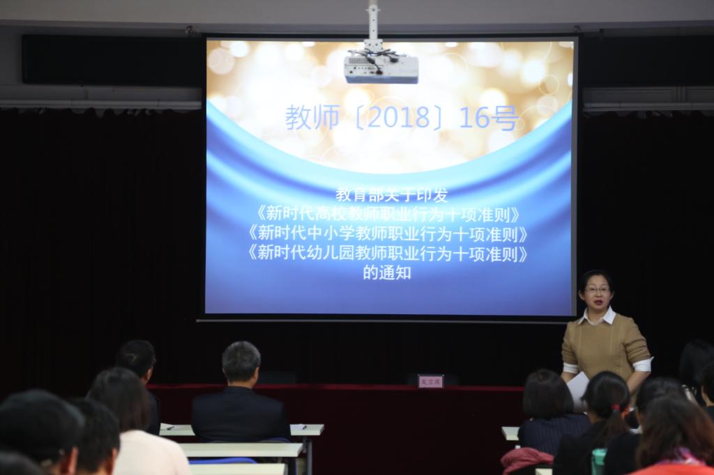 杨佩书记逐条解读了《准则》的具体内容,并指出制定教师职业行为准则,明确新时代教师职业规范,针对主要问题、突出问题划定基本底线,是对广大教师的警示提醒和严管厚爱,是深化师德师风建设,造就政治素质过硬、业务能力精湛、育人水平高超的高素质教师队伍的关键之举,也为教师严格自我约束、规范职业行为、加强自我修养提供了基本遵循。