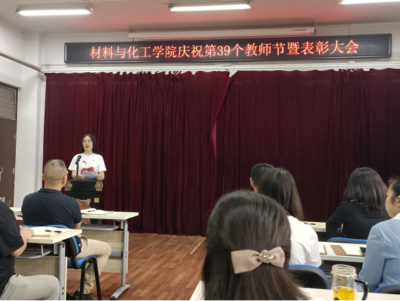 金秋送爽,丹桂飘香。9月5日下午,材料与化工学院在2号实验楼543会议室召开庆祝第39个教师节暨表彰大会,学院全体教职工参加会议,会议由学院党委副书记熊瑛主持。