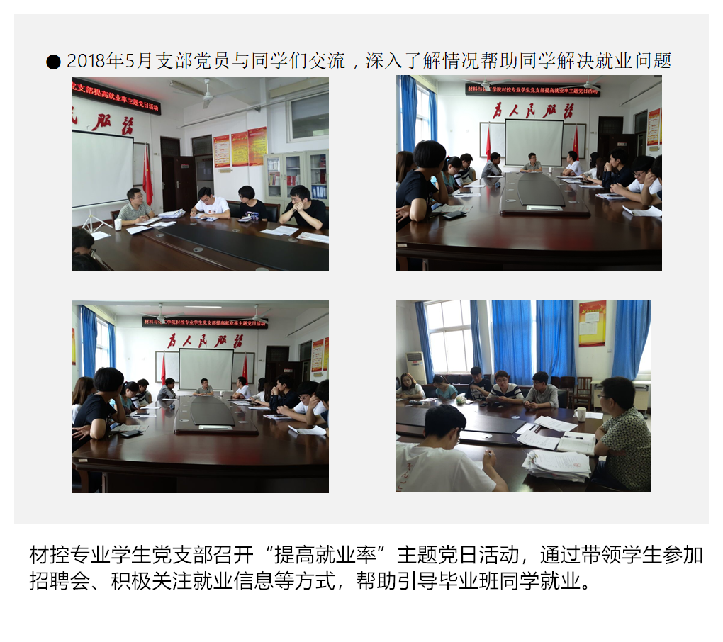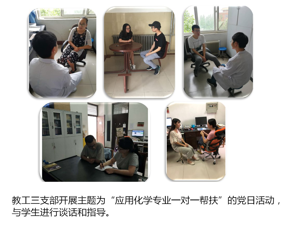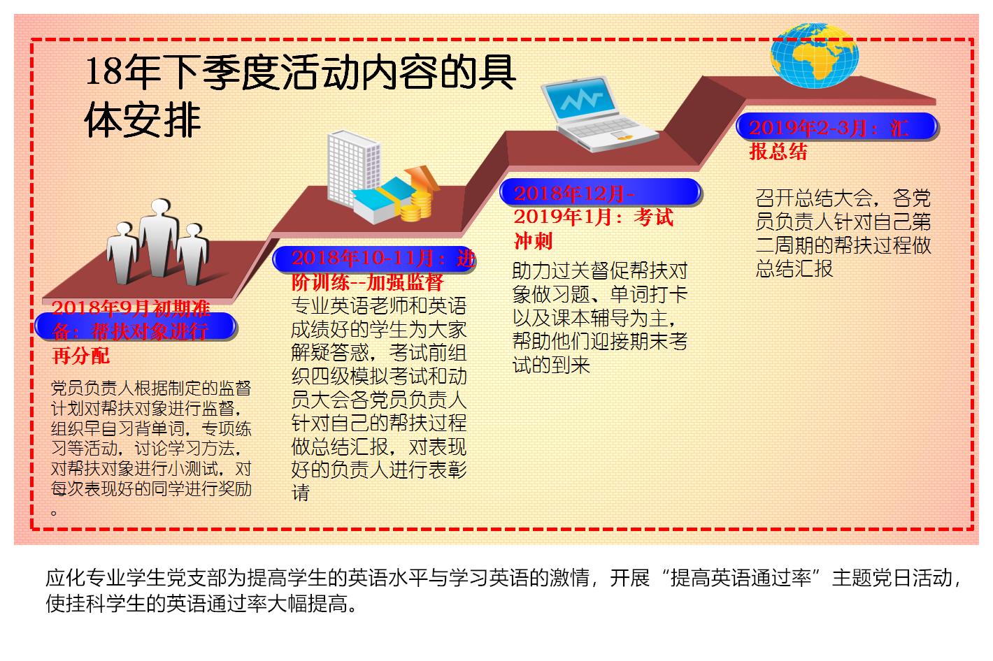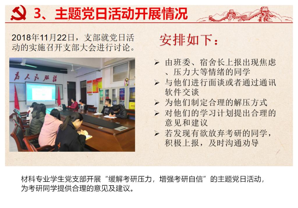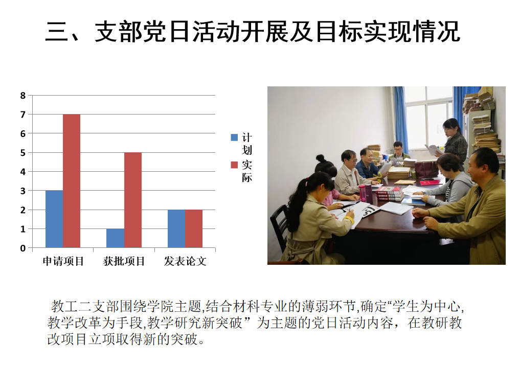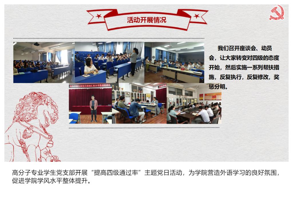 教工一支部支部发挥专业优势制定了签订校企合作协议的目标,目前已签订协议11项,完成横向经费入账150万余元,超额完成了目标;教工四支部针对教学教研薄弱的情况,积极寻找突破口,计划撰写并出版教材1本、教研项目申请书2项、发表教改论文2篇,目前均超额完成任务,除此之外,焦明立、刁泉老师指导的创新团队获得2018年河南省“互联网+”大学生创新创业大赛一等奖并获得国赛铜奖,“高分子材料与工程”获批2018年爱游戏ayx官方网站“专业综合改革试点”立项建设;以“以应用化学专业思政项目组”为载体,成立了教工七支部,创新了基层党组织建设,探索了“知识传授与价值引领同频共振”的有效路径。高分子专业学生党支部开展以“提高四级通过率”为主题的党日活动,通过对16级各班英语四级通过情况统计分析确定帮扶对象,帮扶前该班四级通过率为16.7%,帮扶后通过率达到40%,提升了一半以上。材科专业学生党支部开展以提高考研率为主题的党日活动,目标是研究生考取率达到30%,目前材科15级学生有74%参加了考研,过线率已经达到46.15%;研究生党支部针对学生科研成果少且质量不高的实际情况,制定了提升科研成果的活动计划,完成了25项学术成果,其中一区文章1篇,三区文章3篇,四区文章1篇,EI论文1篇,中文期刊4篇,专利14项,国家级竞赛奖1项。