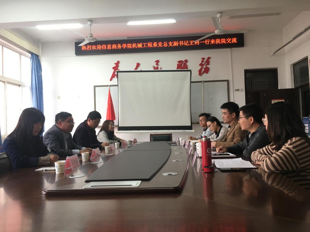 11月1日下午,信息商务学院机械工程系党总支副书记王利一行4人来爱游戏ayx官网交流考察,并在爱游戏ayx官网会议室召开座谈会。爱游戏ayx官网党委副书记周华强,学工办主任邢军阳,辅导员洪潇、艾文英、马向立等人参加了会议,会议由邢军阳主持。