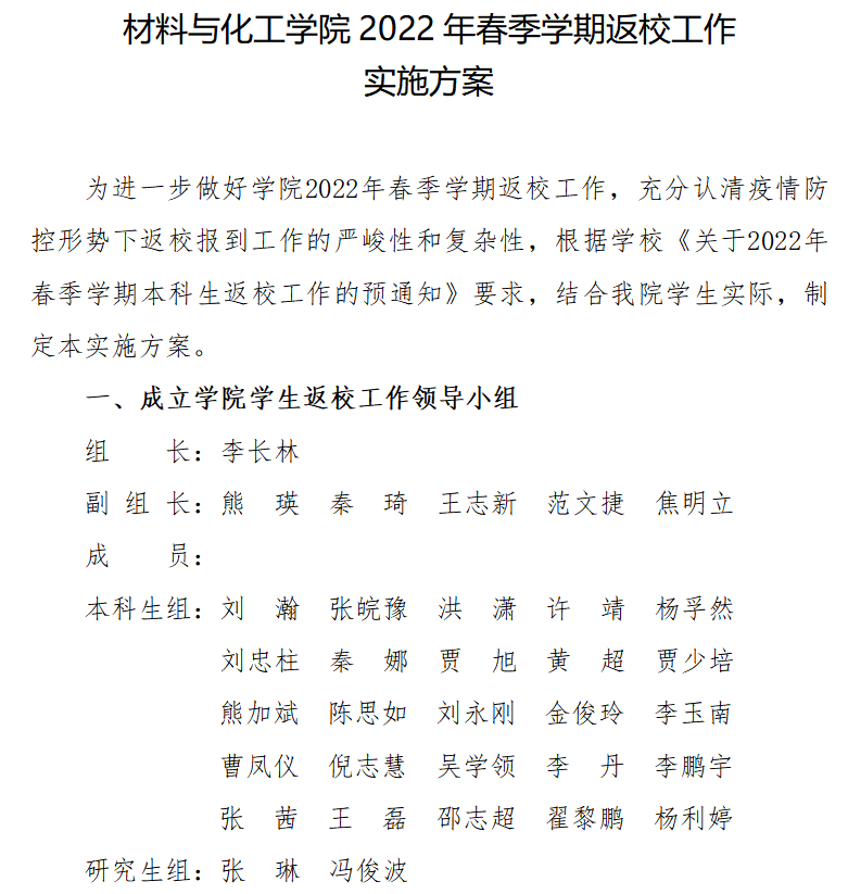勇担职责使命,强化工作落实。学院全面落实“立德树人”根本任务,把维护学生身体健康作为工作的出发点和落脚点,严守底线原则、把握政策导向,严格落实疫情防控各项规章制度。2月17日,学院组织所有专兼职辅导员及班主任召开线上视频会议,学习贯彻落实2022年春季开学工作会议精神。制定《材料与化工学院2022年春季学期返校工作实施方案》,成立学院返校工作领导小组,各担其责,做到未雨绸缪,统筹规划,确保学生平安开学,开学平安。