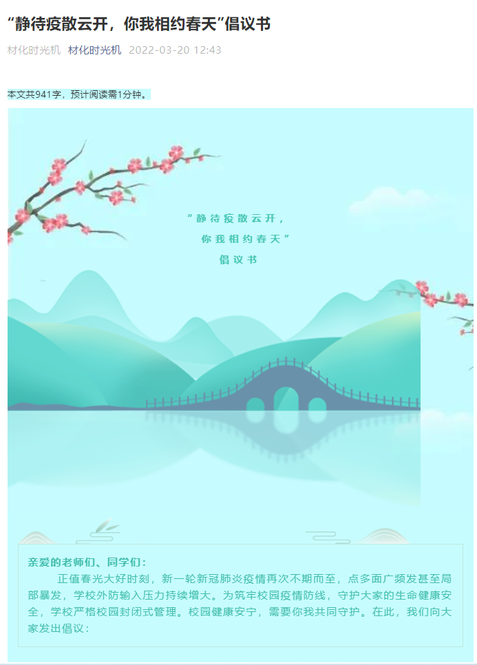 积极宣传引导,提高防控意识。学院依托学生小单元网格化管理工作体系,切实发挥学生骨干作用,通过微信群、QQ群、企业微信等即时传达各项疫情防控通知精神,确保信息畅通无死角。辅导员及班主任通过班委会、主题班会向学生普及疫情防控知识,引导学生正确、理性看待疫情,积极配合和遵守属地疫情防控政策。学院微信公众号“材化时光机”适时推送“假期安全|你若安好,便是晴天”、“同心战‘疫’ 青春先行”、“静待疫散云开,你我相约春天”倡议书等推文,营造团结一致、共克时艰的氛围。