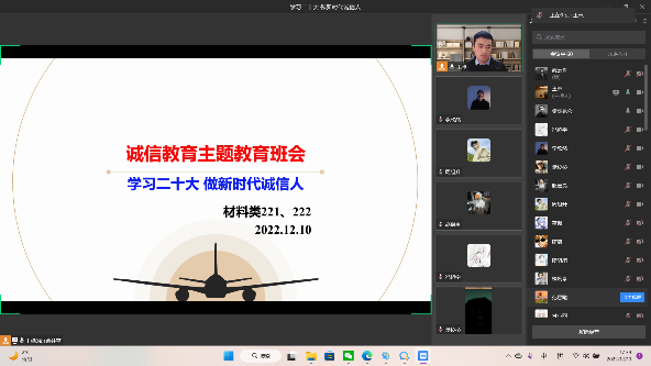 为深入贯彻二十大精神,落实立德树人根本任务,进一步增强广大青年学生的诚信意识和责任意识,切实做好学生资助工作,确保资助政策人人知晓,保障学生各项权益,12月9日—12月12日,材料与化工学院组织各班召开“学习二十大 做新时代诚信人”主题班会。