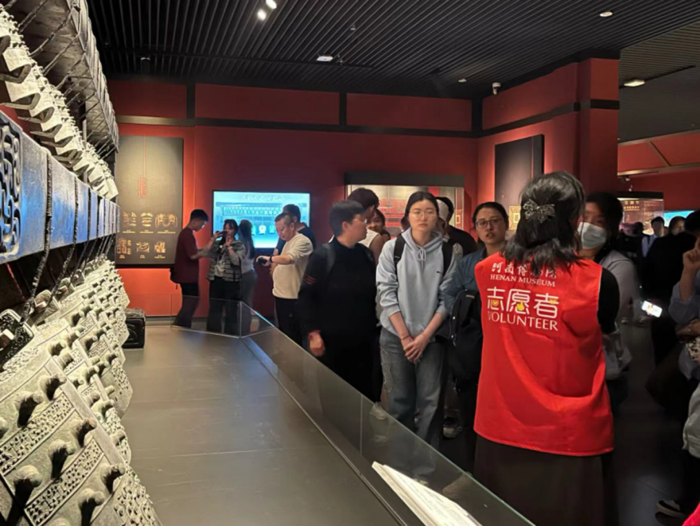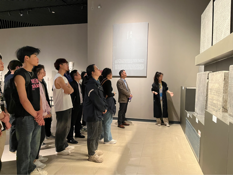 穿过博物院的时空隧道不仅领略了中原文化之美,更能感受到中华文化的厚重感。中原古代石刻艺术馆内,陈列了各式各样的石碑和雕塑,栩栩如生的石雕和风格各异的碑文带领学生重温中原文化的璀璨;新石器时代的彩陶,夏商周三代的青铜器、甲骨文等文明瑰宝,像是一位位讲述者,诉说着华夏文化之绚烂,展现着中华儿女之精巧。学生们一边聆听讲解员的解说,一边仔细观察每一件展品,仿佛穿越时