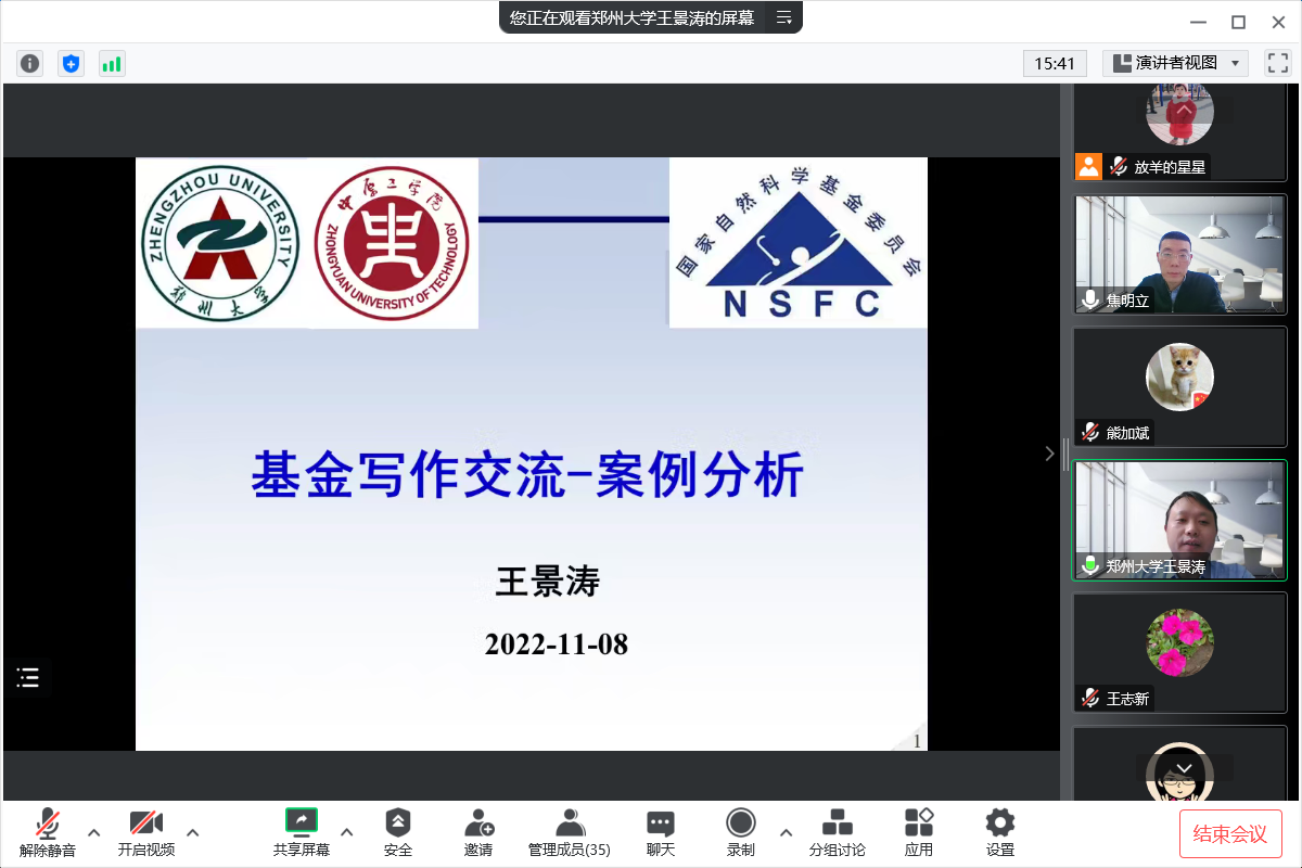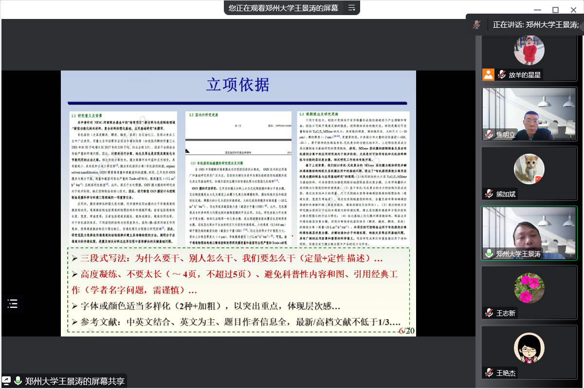 2022年11月8号下午,应爱游戏ayx官网科技处、材料与化工学院和先进材料研究中心邀请,郑州大学化工学院教授、博士生导师王景涛教授在腾讯会议上作了题为“国家自然科学基金写作——案例分析”的学术报告。报告会由材料与化工学院副院长焦明立教授主持,材料与化工学院、先进材料研究中心及其他院部百余名师生聆听了本次报告。