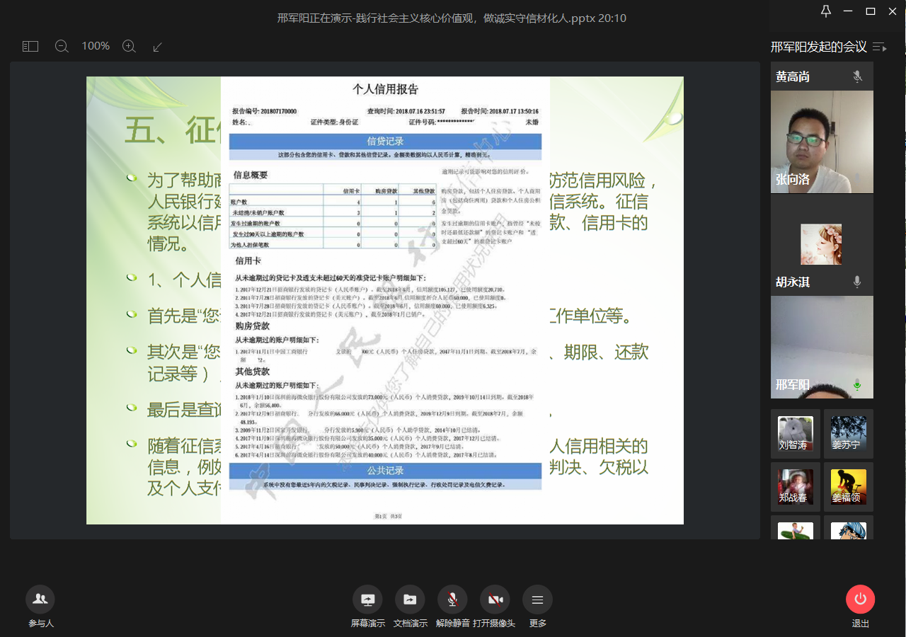 邢老师从高校贷款流程讲起,到助学贷款的性质,再到贷款到期后的处理办法,结合在贷款过程中可能遇到的问题、贷后还本还息以及贷款逾期的影响,突出个人诚信的重要性。告诫同学们要做好个人信息更新,及时还款还息,不要让个人诚信报告出现不良记录,努力践行社会主义核心价值观,做一个诚实守信材化人。